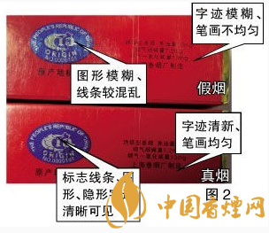 真品“中華”印刷套色準(zhǔn)確,字跡清新、筆畫均勻,字樣邊緣呈細微的齒輪狀,而不是人們普遍認為的平滑狀。假煙字跡模糊、筆畫不均勻,字樣邊緣呈平滑狀。真品“中華”原產(chǎn)地標(biāo)志采用中國地圖圖案,細看海南島和臺灣島為空心,在某些角度和光線下圖案背景會呈現(xiàn)“中華”字樣,標(biāo)志線條、圖形、隱形字跡清晰可見。假煙原產(chǎn)地標(biāo)志圖形模糊、線條較混亂。