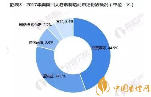 目前,美國(guó)市場(chǎng)上主要有四家大的卷煙制造商:菲莫國(guó)際、雷諾茲煙草公司、帝國(guó)品牌公司以及利格特邁爾斯煙草公司。2017年,菲莫國(guó)際在美國(guó)的市場(chǎng)份額為44.5%,較上年下降了2.1個(gè)百分點(diǎn);雷諾茲煙草公司的市場(chǎng)份額為34.5%,同比上升0.8個(gè)百分點(diǎn);帝國(guó)品牌公司市場(chǎng)份額增長(zhǎng)了0.1個(gè)百分點(diǎn),至8.9%;利格特邁爾斯煙草公司的市場(chǎng)份額增加了0.1個(gè)百分點(diǎn),至3.7%。