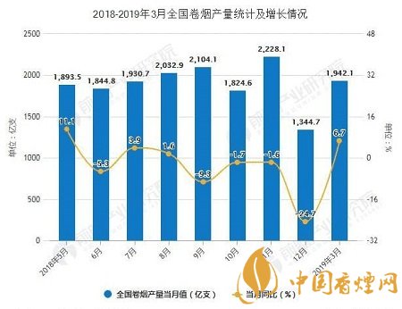 2018年全年全國卷煙累計產(chǎn)量23356.2億支,累計下降0.4%。截止至2019年3月全國卷煙產(chǎn)量為1942.1億支,同比增長6.7%。累計方面,2019年1-3月全國卷煙產(chǎn)量累計達到6911.3億支,同比增長7.8%。