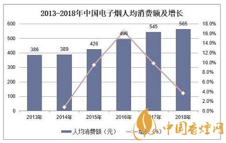 從電子煙人均消費(fèi)額來看,據(jù)統(tǒng)計(jì),截至到2018年,中國電子煙人均消費(fèi)額為565元,同比增長3.7%。