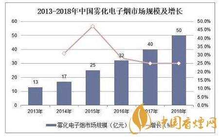 據(jù)統(tǒng)計(jì),2013-18年國內(nèi)霧化煙市場規(guī)模CAGR為+30%,2018年國內(nèi)霧化電子煙市場規(guī)模約50億元,同比增長25%。
