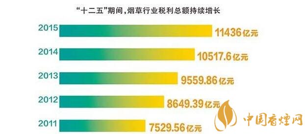 就“十二五”期間,煙草行業(yè)稅利占國家財政收入的比重保持平穩(wěn),始終保持在7.2%~7.5%的較高水平。五年上繳財政總額4.13萬億元,年均增長17.5%,比同期全國財政收入年均增長率高4.7個百分點。2015年,在經(jīng)濟下行壓力持續(xù)加大的情況下,煙草行業(yè)為國家財政增收做出了更大貢獻,充分體現(xiàn)了國家財政收入“蓄水池”的功能。