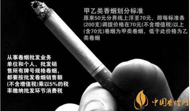 甲類卷煙(調(diào)撥價70元或以上/條):稅率56%,另收0.003元/支,于生產(chǎn)環(huán)節(jié)征收;乙類卷煙(調(diào)撥價低于70元/條):稅率36%,另收0.003元/支,于生產(chǎn)環(huán)節(jié)征收;