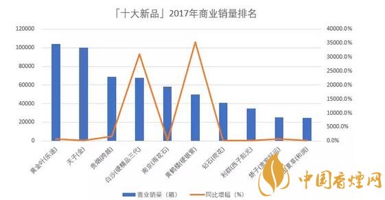 以商業(yè)銷量衡量,「十大新品」2017年合計(jì)銷量57.4萬箱,同比增加40.1萬箱,增長230.8%;十款產(chǎn)品的平均銷量突破5萬箱,平均增量達(dá)到4萬箱;銷量最大的「黃金葉(樂途)」突破10萬箱,最小的「冬蟲夏草(和潤)」也有2.4萬箱;增量最大的「黃金葉(樂途)」超過9萬箱,最少的「利群(西子陽光)」同比增加1.1萬箱。