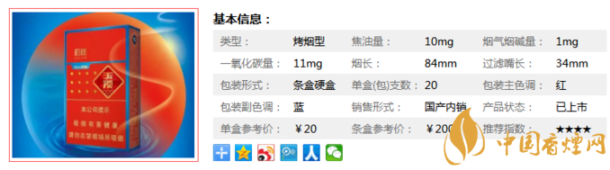 類型 :烤煙型 焦油量 :10mg 煙氣煙堿量 :1mg 一氧化碳量 :11mg