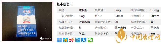 類型 :烤煙型 焦油量 :8mg 煙氣煙堿量 :0.8mg 一氧化碳量 :8mg