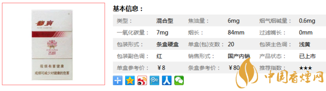 | 煙長:84mm | 過濾嘴長:25mm | 包裝形式:條盒硬盒 | 單盒(包)支數(shù):20 |