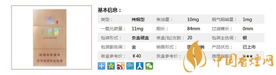 | 類(lèi)型 :烤煙型 | 焦油量 :11mg | 煙氣煙堿量 :1.2mg | 一氧化碳量 :11mg |