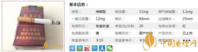 類型 :烤煙型 焦油量 :11mg 煙氣煙堿量 :1.1mg 一氧化碳量 :12mg