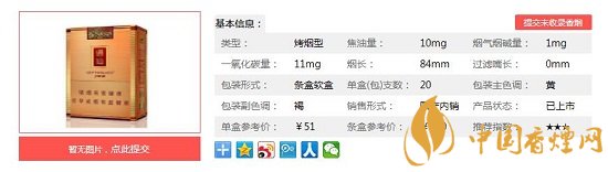 | 類型 :烤煙型 | 焦油量 :11mg | 煙氣煙堿量 :1.1mg | 一氧化碳量 :12mg |