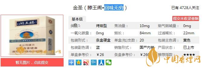 以上便是由香煙網(wǎng)小編為大家介紹的關于金圣(滕王閣·回味無窮)多少錢一包 回味無窮口感及參數(shù)介紹的相關信息,想要了解更多有關內(nèi)容請點擊:阿里山香煙好抽嗎 六款阿里山香煙口感分析