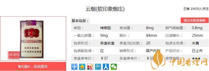 軟印象煙莊香煙煙支用豎紋水松紙卷制,無煙支碼,感覺干凈修長(zhǎng),煙絲切片勻稱色澤黃潤(rùn),填充緊密手感松軟有彈性,非常完美!下面便是云煙(軟印象煙莊)的基本參數(shù):焦油量:8mg 煙堿量:0.8mg 一氧化碳量:9mg.