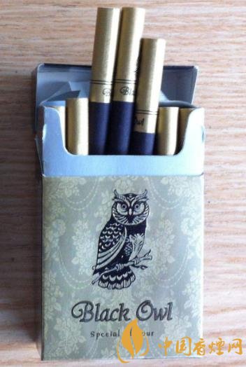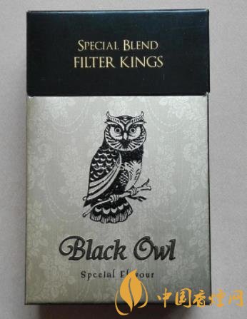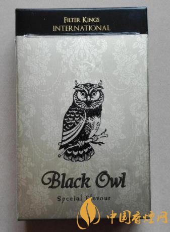 此煙的外包裝還不錯(cuò),正反面都是貓頭鷹的頭像,給人很清爽的感覺,盒蓋和四周都是黑色的,正反面主體是淡金色的,還有暗花的花紋。正面的主體圖案就是一只站在樹枝上的貓頭鷹還是凸版印刷的,下方就是品名BLACK OWL黑貓頭鷹,品名下還有Special Flavour特殊香味,盒蓋上用燙金字體印著FILTER KINGS過濾嘴式,上方還有SPECIAL BLEND特殊混合型。