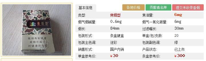 | 煙長(zhǎng):84mm | 過(guò)濾嘴長(zhǎng):30mm | 包裝形式:條盒硬盒 | 單盒(包)支數(shù):20 |