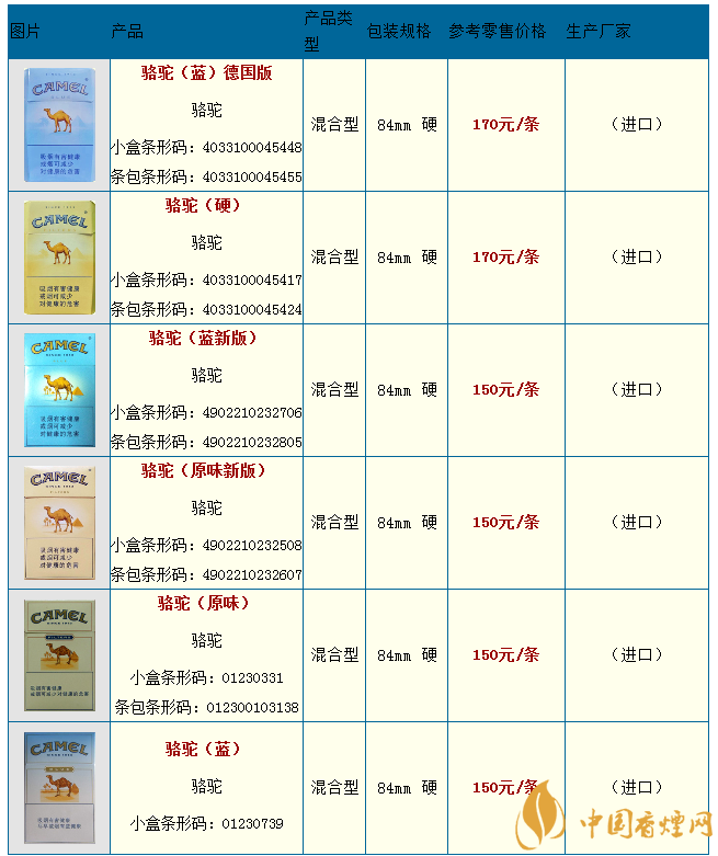 駱駝香煙品種包括了,駱駝(無嘴)、駱駝(軟黃)、駱駝(原味中免)、駱駝(藍(lán)中免)、駱駝(薄荷)、駱駝(特醇俄版)、駱駝(八角藍(lán))、駱駝(硬藍(lán)99s)、駱駝(硬黃99s)等。