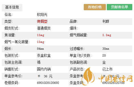 | 利群(西子陽光) | 烤煙型 | 84mm 細支硬 | 310元/條 | 浙江中煙工業(yè)有限責(zé)任公司 |