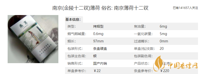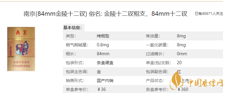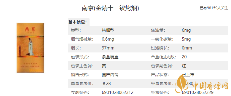 價(jià)格:28元/包,這款南京(金陵十二釵烤煙)是金色的包裝,這也是銷(xiāo)量最好的一款香煙,這款香煙是細(xì)支香煙,柔和但煙氣飽滿純正,沒(méi)有其他細(xì)支寡淡的感覺(jué)。6mg的焦油含量屬于低焦香煙。