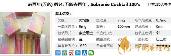Sobranie譯為壽百年,為日本煙草公司所屬英國加萊赫公司產(chǎn)品,作為一個主要消費對象是女性的香煙品牌,這款壽百年(五彩),也是表現(xiàn)的非常好,那么在對五彩壽百年香煙價格表進行一個詳細的分析之前,先來看一看五彩壽百年多少錢一包,它的零售價為30元/包。