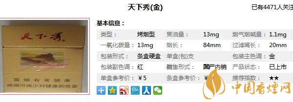 天下秀香煙參數(shù)信息