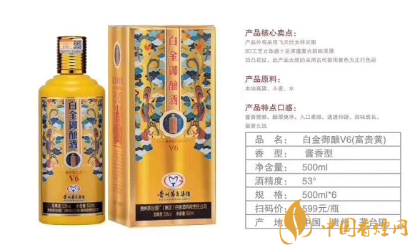 一款酒三個顏色,滿足不同場合需求。白金御釀V6(喜慶紅)包裝采用飛天仕女祥云圖,3D工藝立體感十足深邃復古韻味濃厚,凹凸花紋延用中國傳統(tǒng)節(jié)日喜慶紅色。適合婚宴用酒,V6(商務藍)產品主題色彩根據古代唐朝大臣以為演變而來。特別適合商務贈送。V6(富貴黃)此產品大膽采用古代御用黃色為主題色彩。象征富貴,權勢。宴請接待自飲,高端大氣上檔次。白金御釀酒V6,屬于白金系列中端偏高產品,市場零售價格稍高,每瓶在500多元左右。