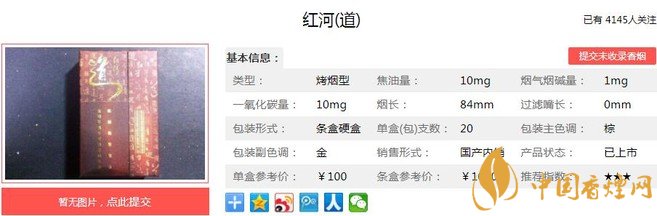 紅河道煙支長84mm,過濾嘴長35mm,煙支造型是不太常見的小方格,煙絲填充飽滿。煙嘴、煙支的包裝工藝都是首屈一指,高端產品的形象一覽無遺。下面我們一起來看紅河道的參數(shù)信息:焦油量:10mg 煙堿量:1.0mg 一氧化碳量:10mg