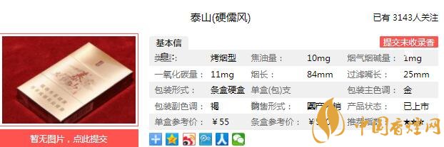 泰山硬儒風煙支長84mm,過濾嘴長25mm,“儒風泰山”的配方和調(diào)香技術嫁接了緩解精神壓力的“香薰”機理,發(fā)揮SPA功效創(chuàng)造出一種“心悅神定”的氣氛。下面我們一起來看泰山硬儒風的參數(shù)信息:焦油量:10mg 煙堿量:1.0mg 一氧化碳量:11mg
