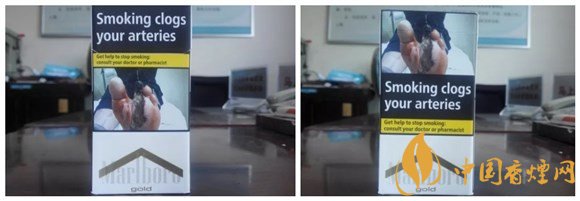 警示圖片的內(nèi)容,與84S紅或白等相同。從樣式上可以看出,它也是一款新版萬寶路。與84S系列相同的,是因為讓位于警示圖片,黑框警示英文字句,轉而移到煙盒的左右側面。#p#副標題#e#
