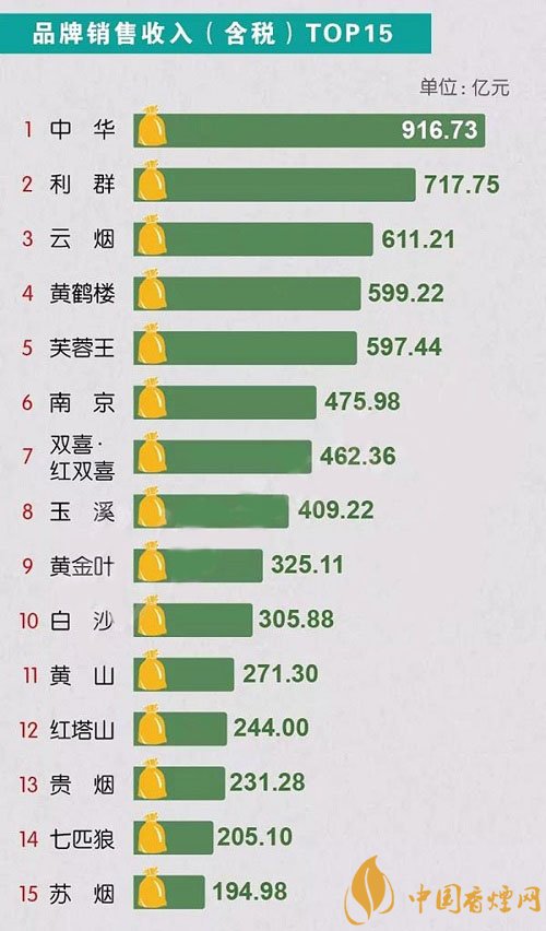 在品牌銷量收入排行榜top5中,中華香煙以900多億的收入當之無愧位居榜首,與第二名利群拉開200億的差距,云煙、黃鶴樓、芙蓉王、南京、雙喜紅雙喜、玉溪、黃金葉、白沙、黃山、紅塔山、貴煙、七匹狼、蘇煙分別位居3-15位,第一名中華的收入也是15名蘇煙收入的5倍。
