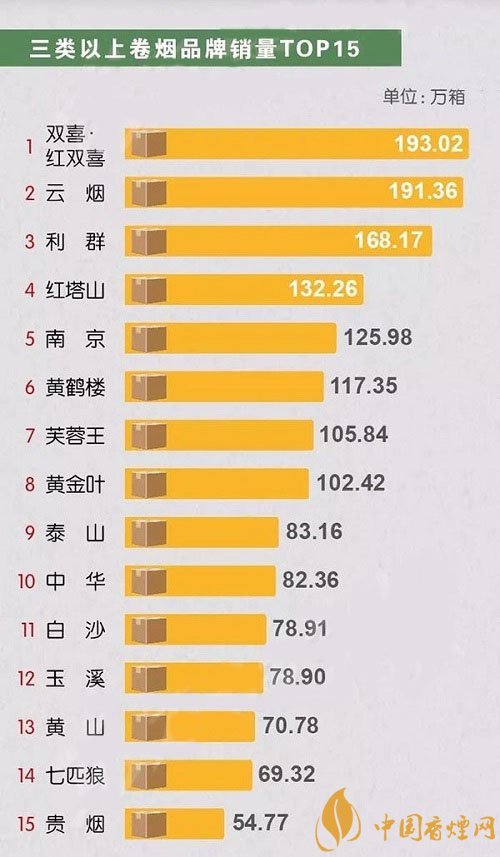 三類以上卷煙品牌銷量中,百年香煙品牌雙喜紅雙喜以微弱的優(yōu)勢位居榜首,云煙緊隨其后與排名第三的利群拉開差距。紅塔山、南京、黃鶴樓、芙蓉王、黃金葉分別位居4-8位,銷量也維持在一百萬箱以上,泰山、中華、白沙、玉溪、黃山、七匹狼、貴煙雖然銷量在一百萬箱一下,但都榜上有名,分別占據(jù)9-15位。一直以來,三類卷煙作為全國卷煙市場的中堅力量,其市場份額之高、覆蓋面之廣、影響力之深,始終備受行業(yè)內外的關注。