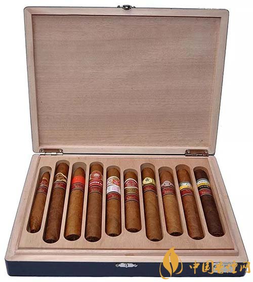 這是2009年發(fā)布的紀(jì)念古巴雪茄節(jié)10周年的版本。每盒雪茄有十支,里面有高希霸、蒙特、烏普曼、好友、帕塔加斯、特立尼達、庫阿巴、圣克里斯托等等,雪茄用了一個10周年標(biāo)簽,總共發(fā)行了兩萬盒。