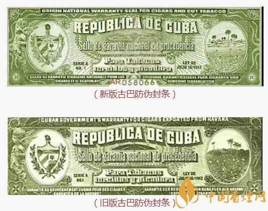 另外,在紫外線的照射下,封條的中間會(huì)出現(xiàn)一個(gè)粉紅色水印,它其實(shí)是古巴共和國(guó)國(guó)徽。在紫外線下同時(shí)出現(xiàn)的,還有防偽序列號(hào),就是上圖中的XX603385字樣。