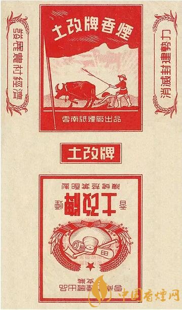 1951~1952年云南紙煙廠出品。主圖為農(nóng)民駕耕牛犁田,副圖為草帽鋤頭麥穗圍成紅色圖案,“發(fā)展農(nóng)村經(jīng)濟、消滅封建勢力”字樣,表現(xiàn)農(nóng)民第一次成為土地的主人,在田間精心勞作形象。1950年云南和平解放,1951年開展大規(guī)模的土地改革運動。該煙標(biāo)是中國煙標(biāo)史上少見的“土改”牌煙標(biāo)。