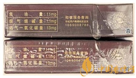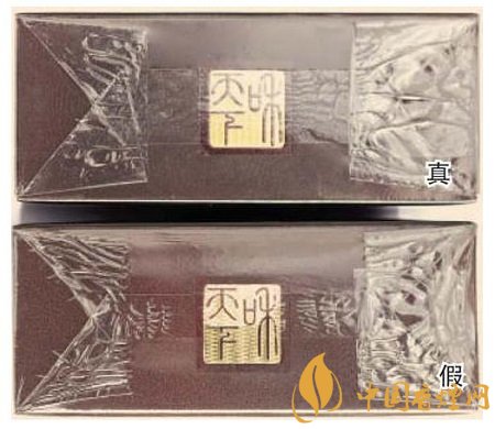 真煙商標紙采用復(fù)合鐳射銀卡紙,膠印和絲網(wǎng)印刷,“和天下”字體采用壓凸燙金工藝,用手摸凹凸感較明顯,且字體筆畫較粗,商標紙上字體、拼音、花紋看上去有較清晰的豎線;假煙一般為高清掃描仿制印刷,“和天下”字體用手摸凹凸感不明顯,且字體筆畫較細,商標紙上拼音、花紋等處豎線較模糊。
