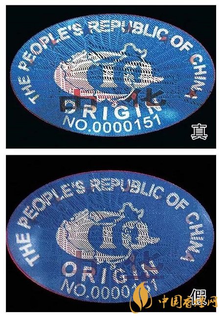 4、“中華”原產(chǎn)地標(biāo)志為藍(lán)色橢圓形,折光可見(jiàn)“中華”字樣、8顆“★”及天安門(mén)圖案。真煙色彩飽滿(mǎn),圖案清晰;假煙色彩暗淡,圖案模糊。