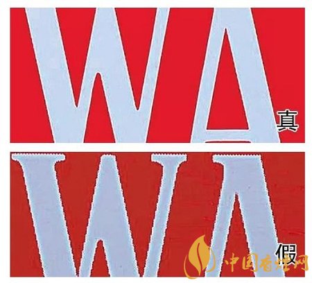 6、真煙白色字體邊緣規(guī)整光滑,字跡飽滿(mǎn);假煙白色字體邊緣粗糙,色彩污濁,有明顯鋸齒印。