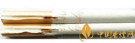 真煙采用復(fù)合銀色鋁箔紙,煙徽(三潭)壓花工藝,“潭”上方呈三角形狀;假煙采用普通鋁箔紙,“潭”上方呈柱狀,與真品特征存在明顯差異。(左真右假)