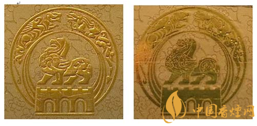 假冒卷煙:該款假冒卷煙南京市徽圖案,無凹凸感,色彩暗淡,圖案模糊。(左真右假)