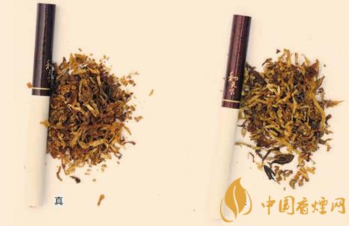 真煙煙支采用復合濾嘴,煙絲切絲寬度均勻,煙絲疏松、光澤油潤性好、呈檸檬黃色,煙絲結構為葉絲和少量膨脹梗絲;假煙煙支采用普通濾嘴,制絲工藝簡單,煙絲寬度不均勻,有少量梗絲,未經過膨脹處理。