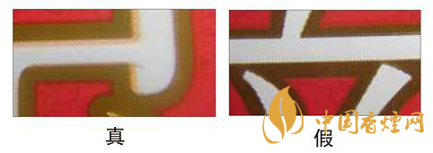 看條盒商標(biāo)印刷。真煙套印準(zhǔn)確,凹印效果好,邊緣圖紋圓潤。假煙沒有凹凸效果,且邊緣圖紋粗糙。
