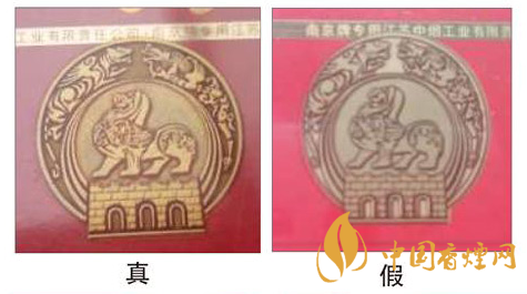 看小盒拉帶。真品“南京”(紅)拉帶上字體清晰,光澤鮮艷,字體里有許多細(xì)小的水平紋路。假煙筆畫較粗,光澤暗淡。